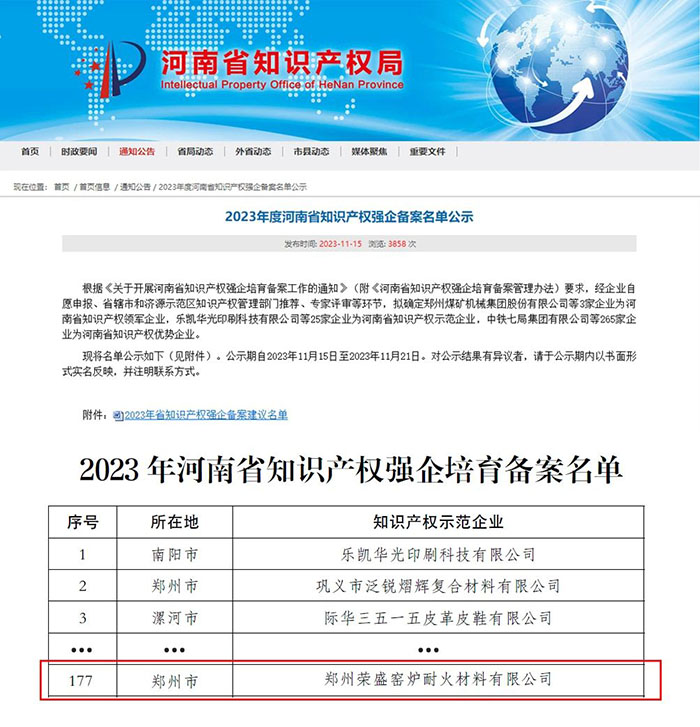 近日,河南省知識(shí)產(chǎn)權(quán)局公布2023年度河南省知識(shí)產(chǎn)權(quán)強(qiáng)企備案名單,鄭州榮盛窯爐耐火材料有限公司(以下簡(jiǎn)稱「榮盛耐材」)榮獲「知識(shí)產(chǎn)權(quán)優(yōu)勢(shì)企業(yè)」稱號(hào),知識(shí)產(chǎn)權(quán)綜合實(shí)力獲官方認(rèn)可。這是今年以來(lái),榮盛耐材在知識(shí)產(chǎn)權(quán)領(lǐng)域獲得的又一項(xiàng)榮譽(yù)。