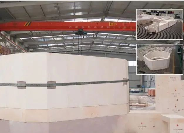 其產品優(yōu)點為:①使用了電熔氧化硅結合相,不含氧化鈣成分,二氧化硅含量可達98.5%以上;②密度更小(1.8g/cm3),降低了整個大碹的重量;③價格相比同級別電熔材料更低;④比硅磚具有更低的膨脹系數(shù)(650℃時0.6%)、更高的使用溫度(T0.5為1690℃);⑤更好的體積穩(wěn)定性。在國內某全氧燃燒窯爐上有使用經(jīng)歷,但大碹出現(xiàn)威脅到窯爐的變形問題。