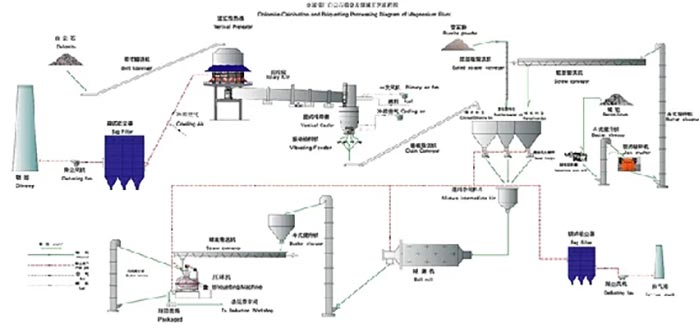 金屬鎂生產(chǎn)工藝-旋轉(zhuǎn)窯煅造白云石生產(chǎn)工藝:抓斗起重機(jī)將白云石送往皮帶運(yùn)輸機(jī),根據(jù)震動(dòng)篩選出合格的金屬鎂,由大傾角帶送往預(yù)熱器頂端料倉(cāng)。料倉(cāng)里的白云石根據(jù)六根滑管進(jìn)到預(yù)熱器,煅造中產(chǎn)生的約900℃熱煙氣與白云石在此傳熱。當(dāng)白云石被加熱到800℃時(shí),液壓推桿將石塊送至回轉(zhuǎn)窯尾端鍛練。鎂回轉(zhuǎn)窯的旋轉(zhuǎn)使石白云石受熱均勻,并逐步向窯頭方向移動(dòng)。窯頭罩處安裝燒嘴,點(diǎn)燃溫度做到1250℃,以適應(yīng)活力煅白對(duì)溫度的需求。熱煅燒白從窯頭掉入冷卻塔,與風(fēng)機(jī)鼓入的二次空氣傳熱。氣體加熱至600℃左右,進(jìn)到窯頭點(diǎn)燃,煅燒白冷卻至100℃以下,依據(jù)給料機(jī)對(duì)稱掉入鱗板輸送機(jī),輸送至下一道工序。離去預(yù)熱器約260℃的廢氣,通過管道進(jìn)到布袋除塵器,凈化廢氣,完成標(biāo)準(zhǔn)排出,進(jìn)行煅造金屬鎂的整個(gè)生產(chǎn)過程。