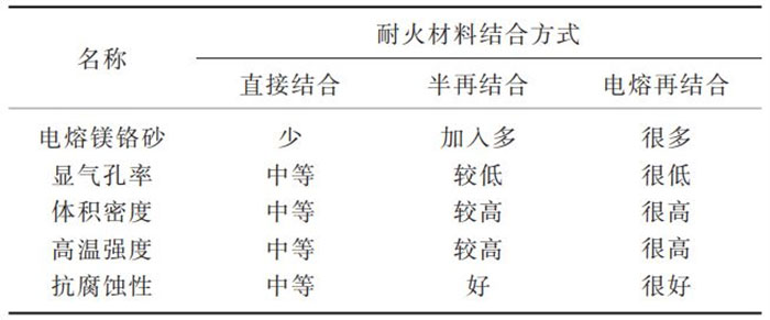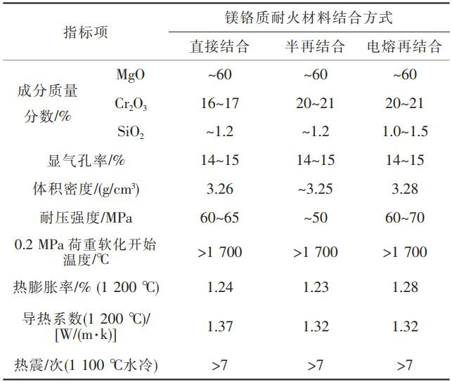 根據(jù)鎂鉻質(zhì)耐火材料的結(jié)合形式的不同,包括直接結(jié)合、半再結(jié)合、電熔再結(jié)合等鎂鉻質(zhì)耐火材料。其中,直接結(jié)合鎂鉻質(zhì)耐火材料是以高純燒結(jié)鎂砂和鉻鐵礦為原料,將電熔鎂砂與鉻礦直接燒結(jié);半再結(jié)合鎂鉻質(zhì)耐火材料是以電熔鎂鉻砂作屬粒,加入部分鉻礦和鎂砂或燒結(jié)合成鎂鉻料作細(xì)粉,高溫?zé)Y(jié)而成;電熔再結(jié)合鎂鉻質(zhì)耐火材料是將鉻礦與電熔鎂砂在電爐中電熔,制得電熔鎂鉻砂,再高溫?zé)Y(jié)而成。3類鎂鉻質(zhì)耐火磚材料特性對(duì)比,見表1。