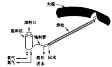 焊補(bǔ)設(shè)備主要由焊槍、混料機(jī)、操作控制盤(pán)、冷卻水加壓泵、高壓橡膠管組成。輔助設(shè)備有:均料機(jī)、耐材切割鋸、小型液壓站、冷卻設(shè)備等。工作條件要求:0.4MPa以上的純氧,0.02MPa的氮?dú)猓?MPa的水壓。焊補(bǔ)工作示意圖見(jiàn)圖1。