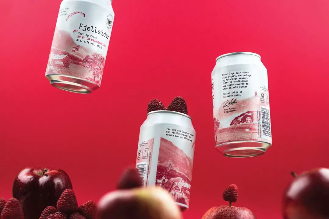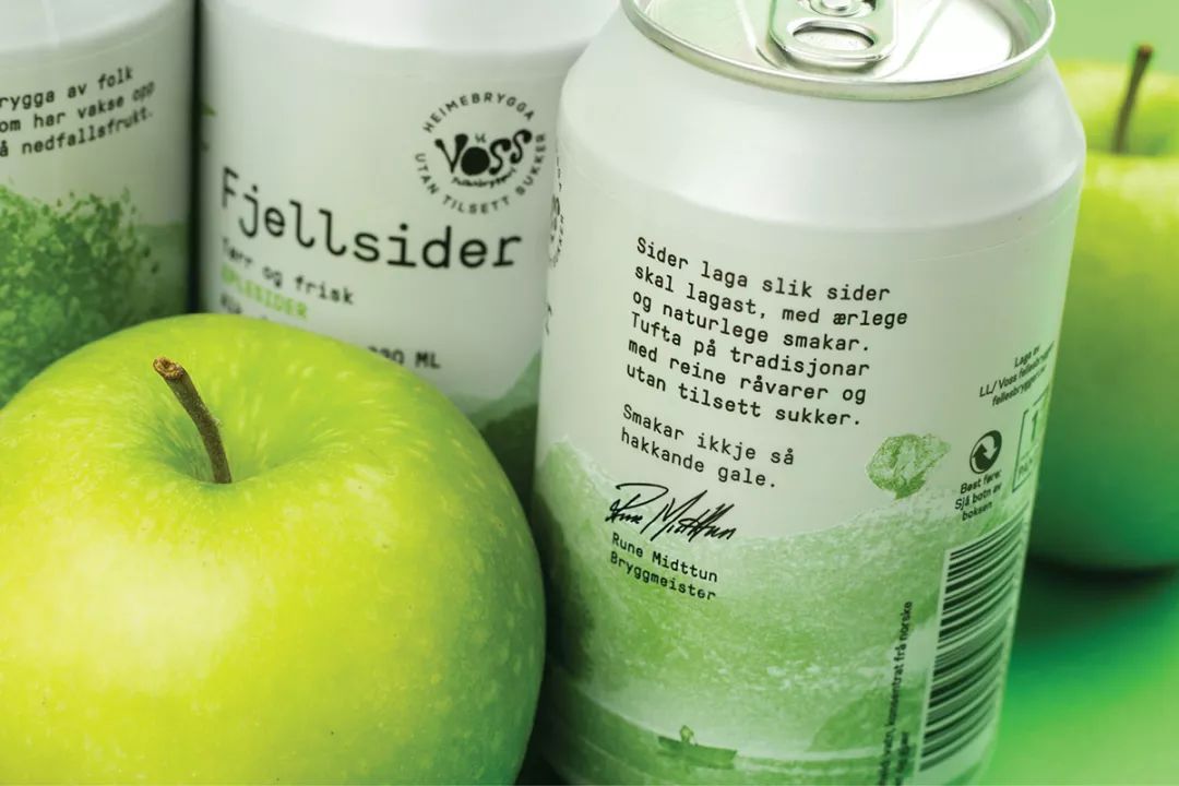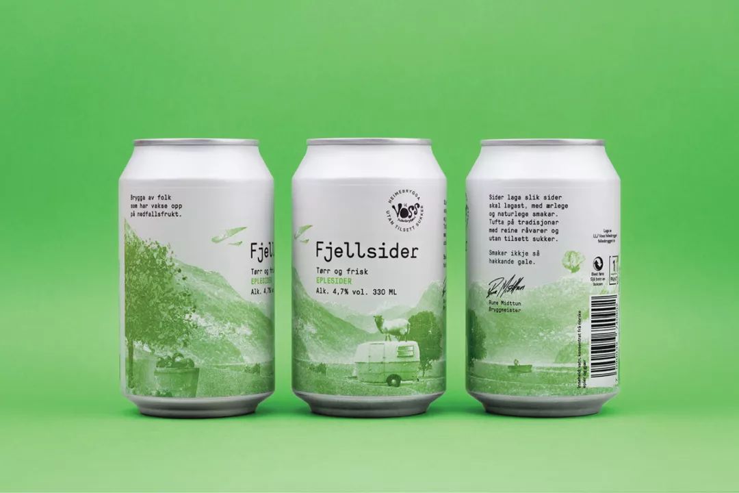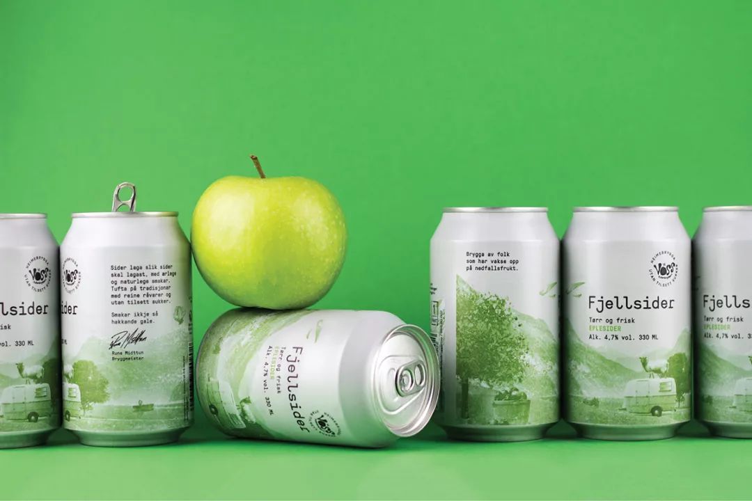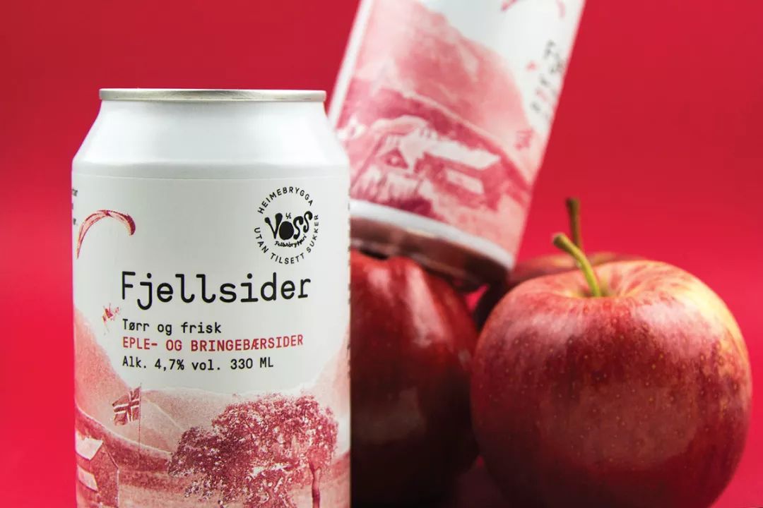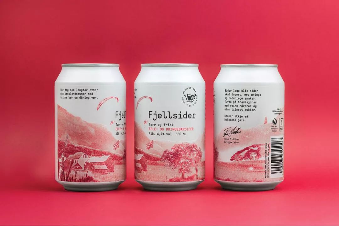 Voss Fjellsider 是一款蘋果酒品牌,挪威設(shè)計團隊為其設(shè)計的包裝,設(shè)計師為包裝繪出一組山間風(fēng)景插畫,使用絲印的工藝制作而成,畫面以紅蘋果、青蘋果兩塊單色呈現(xiàn),很好的呈現(xiàn)了酒與蘋果之間那種朦朧的感覺。